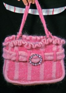 | Aune Purse is a purse that I designed for my friend Anne. She is a ultimate girly girl. Hence, I have chosen 2 shade of pink for the main color. I added the mohair yarn for the accent. To make the purse more girly, I added a buckle belt with rhinestone and added ruffles to the top of the purse. This purse is worked using 2 strands of cascade yarn and 1 strand of accent yarn throughout in exception of the I-cord handle. The handle is worked using 1 strand of cascade yarn with size 10.5 dpn.